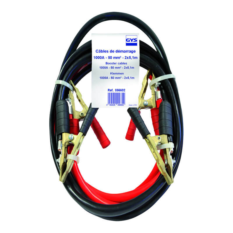 Startkabelsats Pro 50 mm² 1000 A - 5,1 meter från Gys är en mycket kraftig, professionell startkabelsats för 12–24 V fordon. Med 50 mm² kabelarea och maxström 1000 A är den anpassad för höga startströmmar på större fordon, entreprenad- och lantbruksmaskiner där batterierna belastas hårt och kräver stabil starthjälp. Kabeln är 5,1 meter lång, vilket ger extra räckvidd mellan fordonen och underlättar anslutning även när batterier eller anslutningspunkter sitter svårt till, samtidigt som strömöverföringen förblir effektiv. De mycket kraftiga oisolerade klämmorna ger direkt och effektiv kontakt mot batteripoler eller jordpunkter, vilket ger god strömöverföring men kräver att du arbetar noggrant och följer gällande säkerhetsanvisningar. Kablarna har lätt utbytbara klämmor om de skulle med tiden bli slitna.