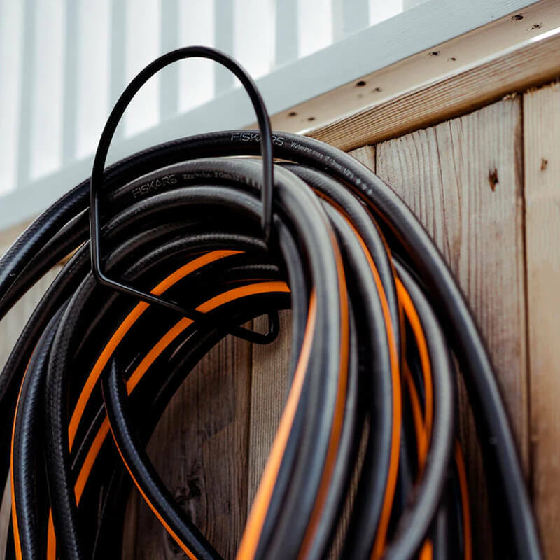 Slanghållare för upphängning av slangar, sladdar, m m. Monteras på vägg med medföljande väggadapter eller på Toolflex One skena (köpes separat).